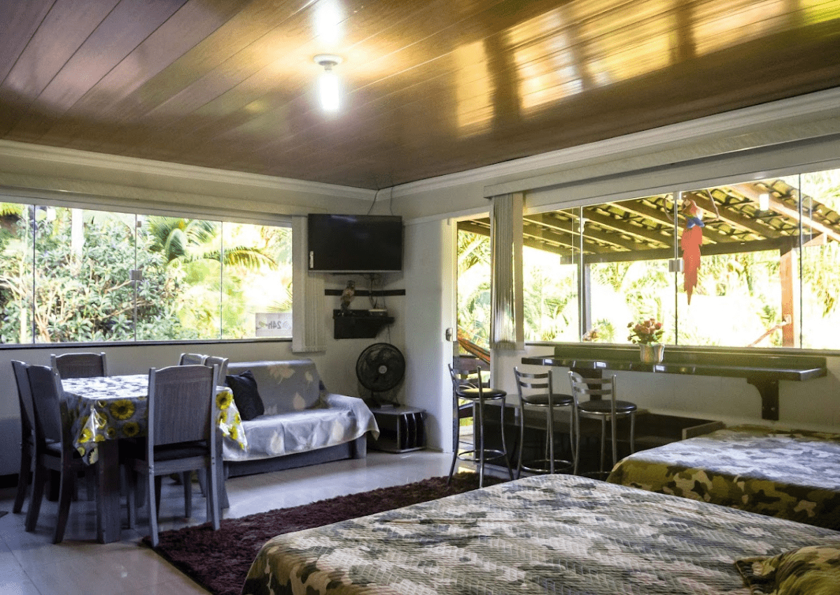 Nossos quartos são um verdadeiro deleite, com uma decoração elegante e um conforto que faz com que nos sintamos em casa. A luz natural que entra pelas grandes janelas ilumina o ambiente, e a vista para a natureza ao redor nos proporciona uma sensação de paz e renovação.